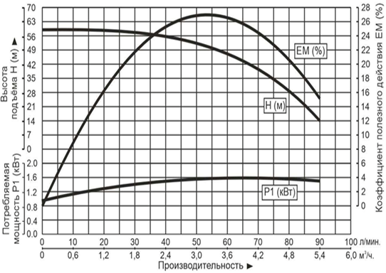 | В насосной камере насоса последовательно установлены 6 крыльчаток (ступеней), что значительно увеличивает производительность и высоту подъема. |